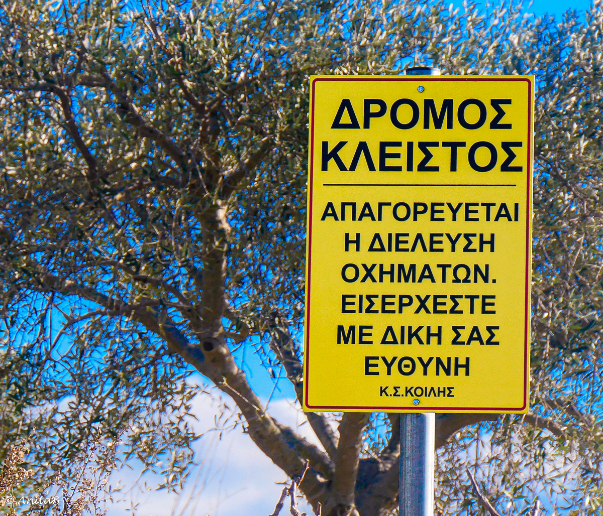 Absolut rena grekiskan! Testade en Google-översättning och den blev såhär: VÄGEN AVSTÄNGD FORDON ÄR FÖRBJUDET. INGÅR PÅ EGEN RISK K.S. KOILIS