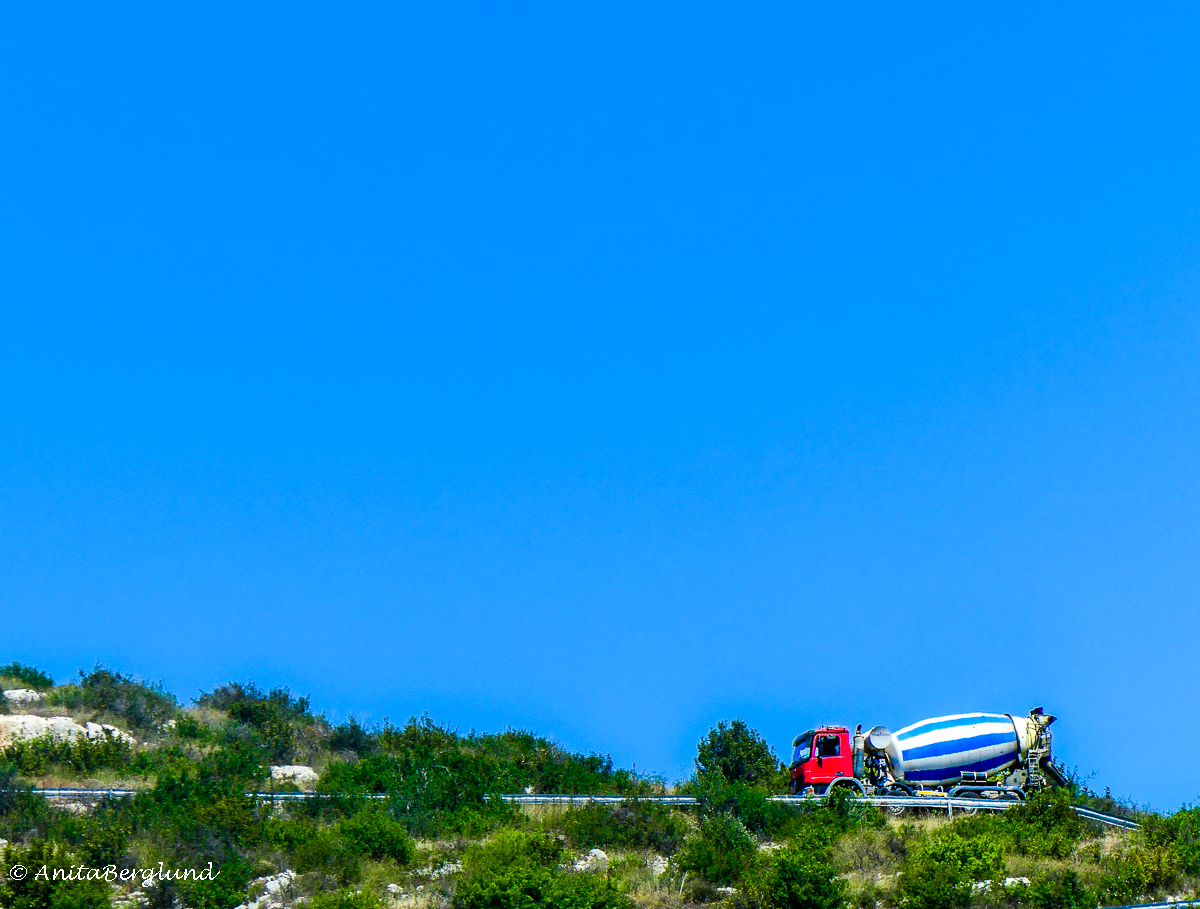 1. Den här bilden fastnar jag för när jag tittar på alla dina nya bilder. Så effektfullt med den vida blå himlen och så betongbilen med det röda och de blå ränderna – och färgen återkommer även i vägräcket. Lyckat!