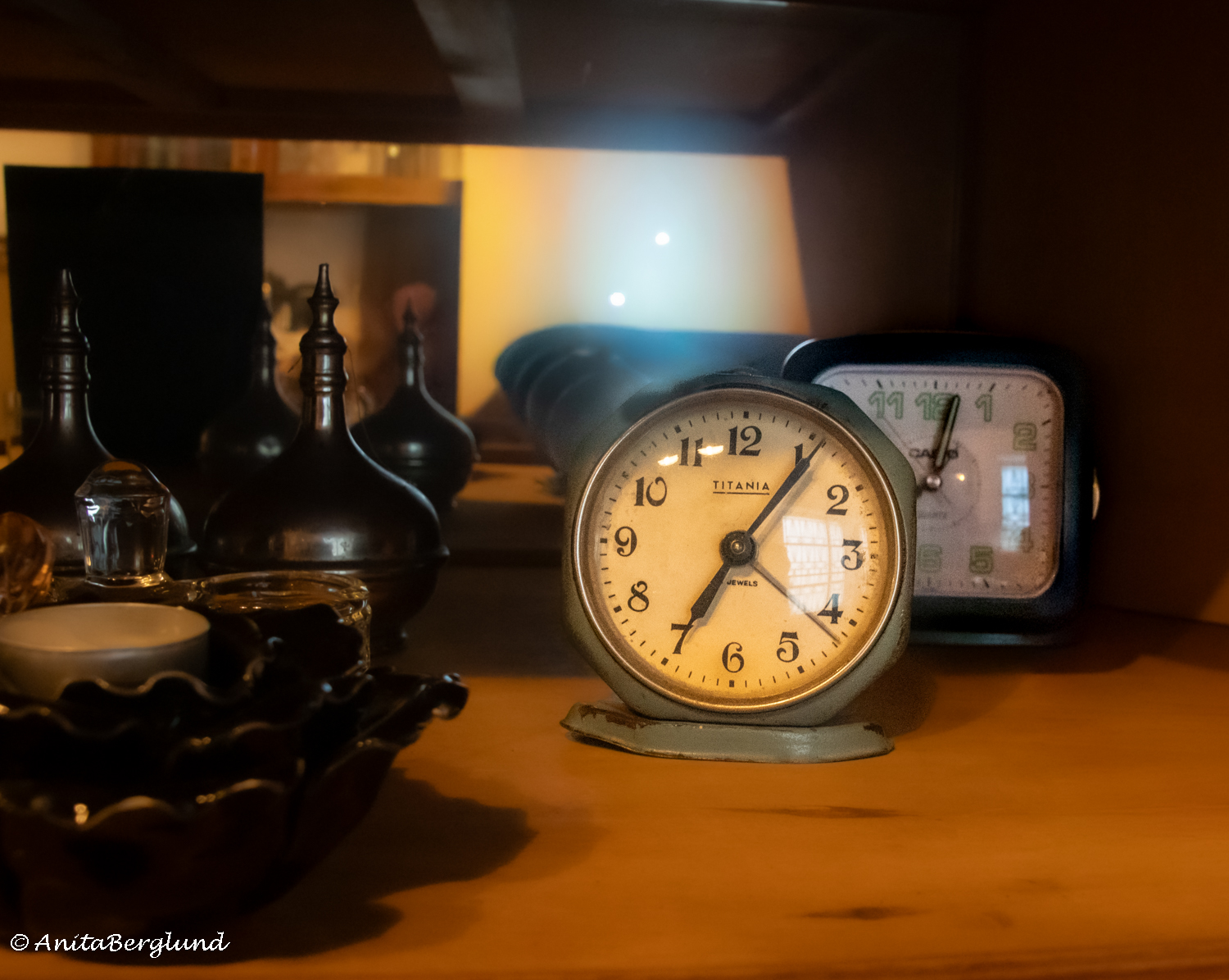 Blir lite nyfiken på vad allt som finns i bilden med klockorna, spännande med djupet och ting i många lager – och ljuset. Fina bilder på gamla ting, denna färgvariant på telefonen har jag nog aldrig sett tidigare.
