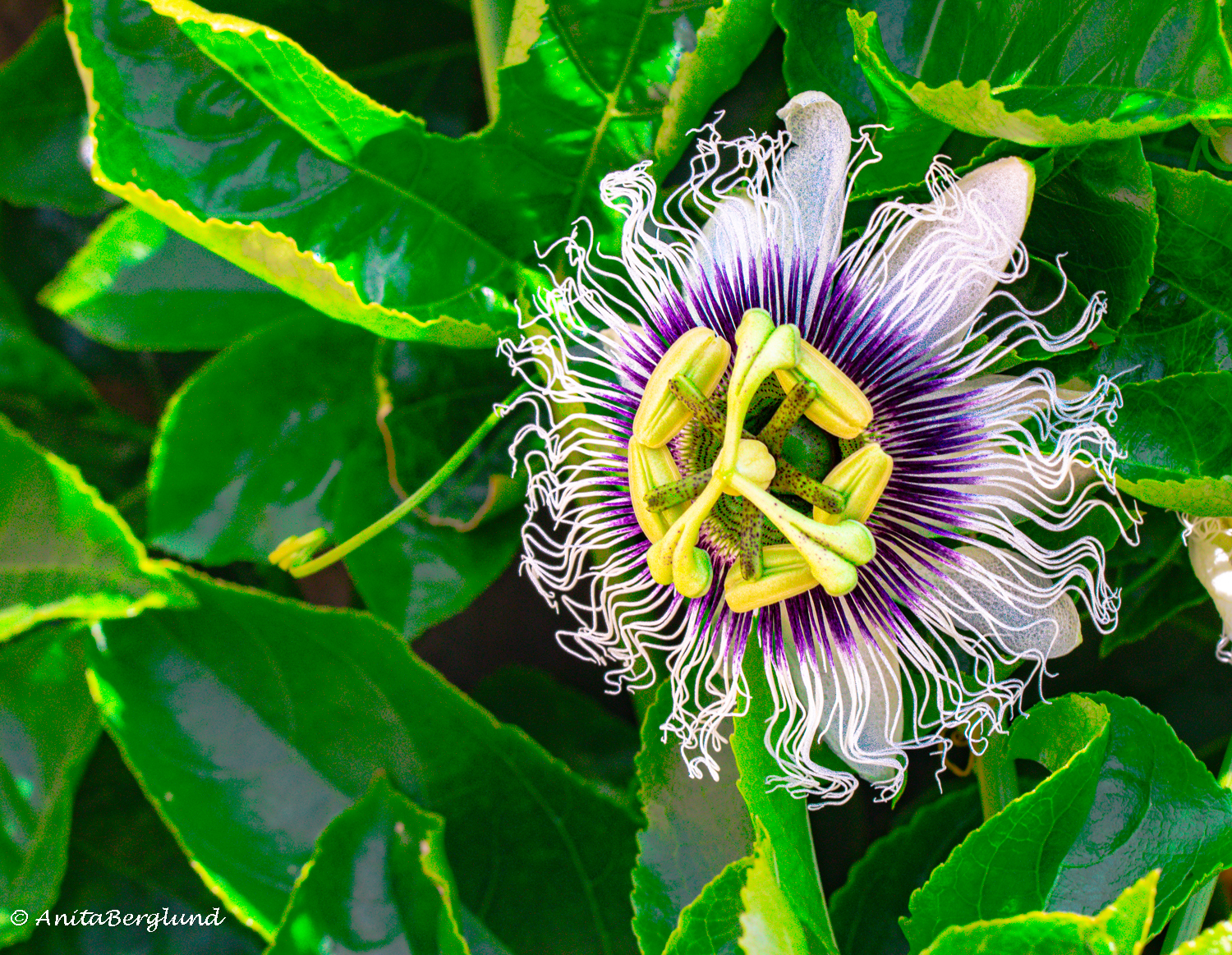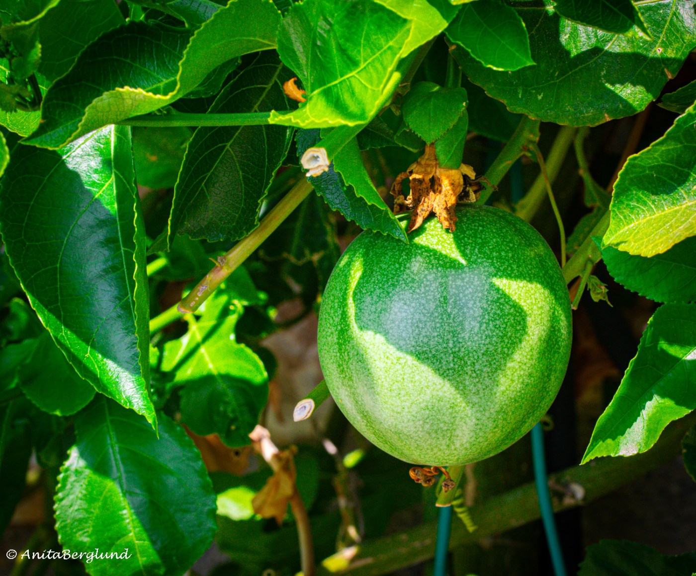 I min trädgård har jag några passionsfruktsplantor. De växer otroligt snabbt, har exotiska blommor och ätbara frukter. Frukten som syns ovan är inte mogen ännu, en mogen frukt har skrynkligt skal och mörk färg. De är goda men inte min passion när det gäller frukter.