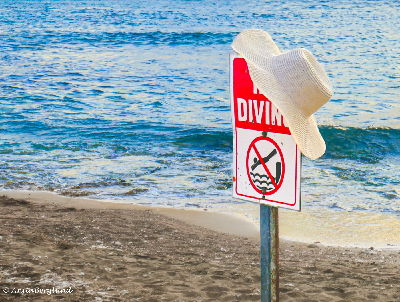 Snygga strandbilder med skylten som utropstecken, hatten dämpar lite, bidrar med lite melankoli. Jag har just läst ett inlägg där en person försvann, bara kläderna låg kvar på stranden och nu är han till slut dödförklarad. Men jag förstår att hattar ibland blir kvar på stränder.