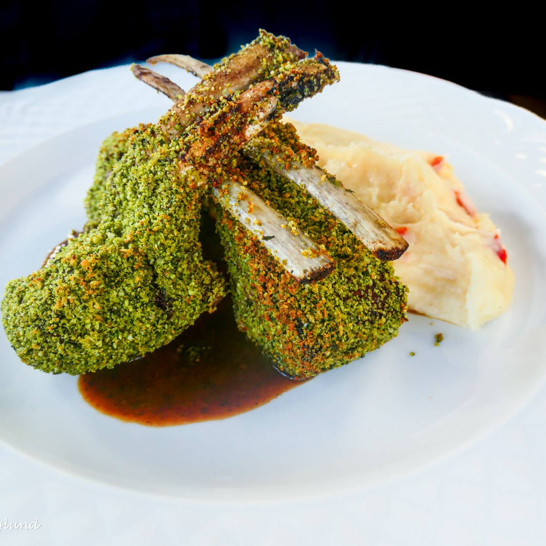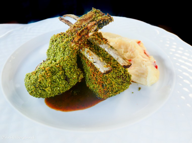 Maten var en fröjd för ögat, speciellt lammkotletterna. Hade aldrig gissat på lamm där, och absolut inte med den ”kryddmixen”. Det är kanske den ryska varianten av lammkotletter. Din sallad är vad som kallas ”rysk sallad” i Spanien. Snyggt upplagd, men inte riktigt min grej.