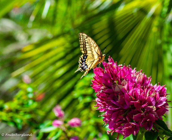 Mitt första inlägg i årets utmaning var en vildblomma omgiven av gröna toner. Vid utmaningens fullbordan landar en fjäril på en bougainvillea-blomma i min trädgård. Cirkeln är sluten.