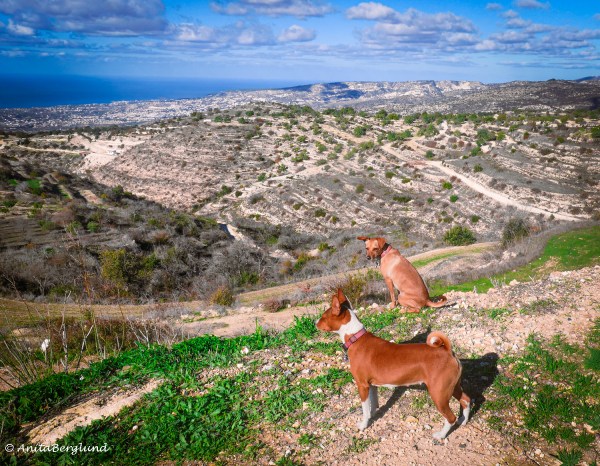 När jag inte går min vardagsstig, nedanför där vi bor, åker jag istället uppåt. Här är vi 600 m.ö.h. och det syns inte, men precis framför där hundarna sitter är en brant sluttande vägg.