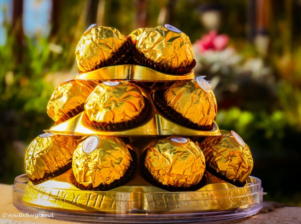 Ferrero Rocher-chokladpraliner inlindade i guldigt papper. De var min ursprungliga tanke att använda till temat Guldigt, tills jag åkte till mallen... Den här guldkantade stolen fotade jag igår när jag var i Paphos shoppingmall, Kings Avenue. Tycker den är lite roligare än det guldiga pappret, men låter båda bilderna vara med.