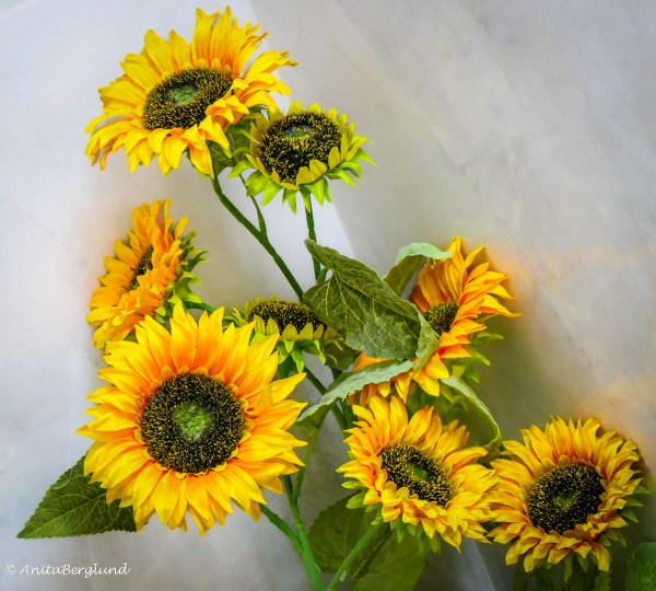 Vincent van Gogh älskade att måla solrosor. Jag fotograferade mina konstgjorda och redigerade bilden. Det blev inte Van Gogh, men kanske något i färgerna kan föra tankarna dit.