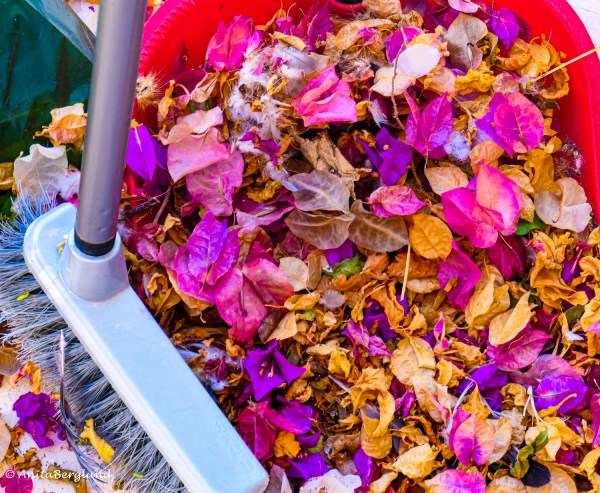 Mitt första inlägg i årets utmaning var en vildblomma omgiven av gröna toner. Vid utmaningens fullbordan landar en fjäril på en bougainvillea-blomma i min trädgård. Cirkeln är sluten.