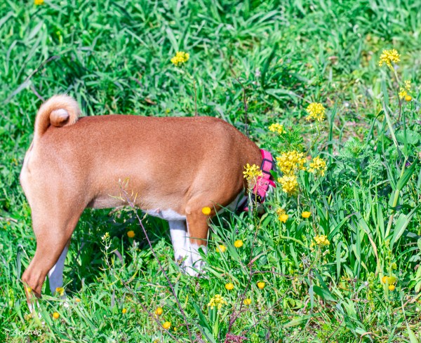Hopp och lek i det fria ger lyckliga hundar, medan matte oroar sig för att det kan finnas ormar som ligger dolda i grönskan.