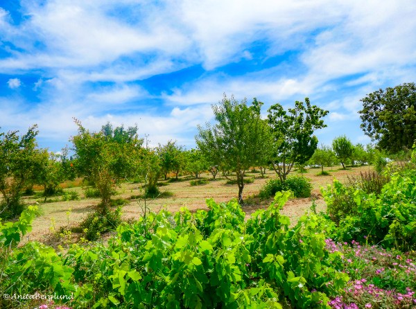 I förgrunden på övre bilden syns vindruvor medan träden ger körsbär, granatäpplen, fikon och den så speciella frukten från Johannesbrödträd. Till varje bild i kollaget finns en kort text.
