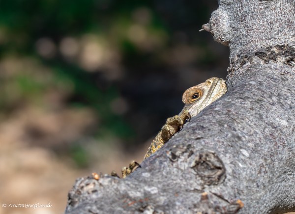 En ödla är på väg neråt medan en annan kikar fram bakom stammen. Den som var på väg neråt tog ett skutt och hoppade ner på marken när jag kom lite för nära med kameran.
