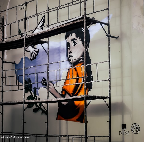 Såg den här väggmålningen på en bakgata i Paphos gamla stad och tänkte, skepparkrans. Men, enligt Synonymer.se är en skepparkrans lika med kortklippt helskägg, utan mustasch! Kunde redigerat bort mustaschen men tänker att han har en skepparkrans, och mustasch.